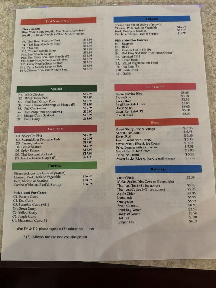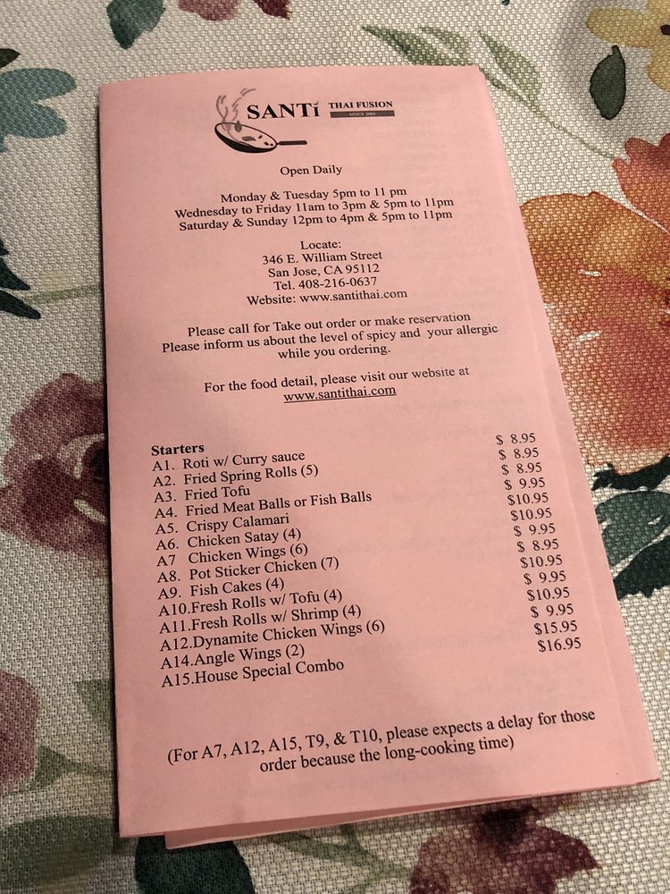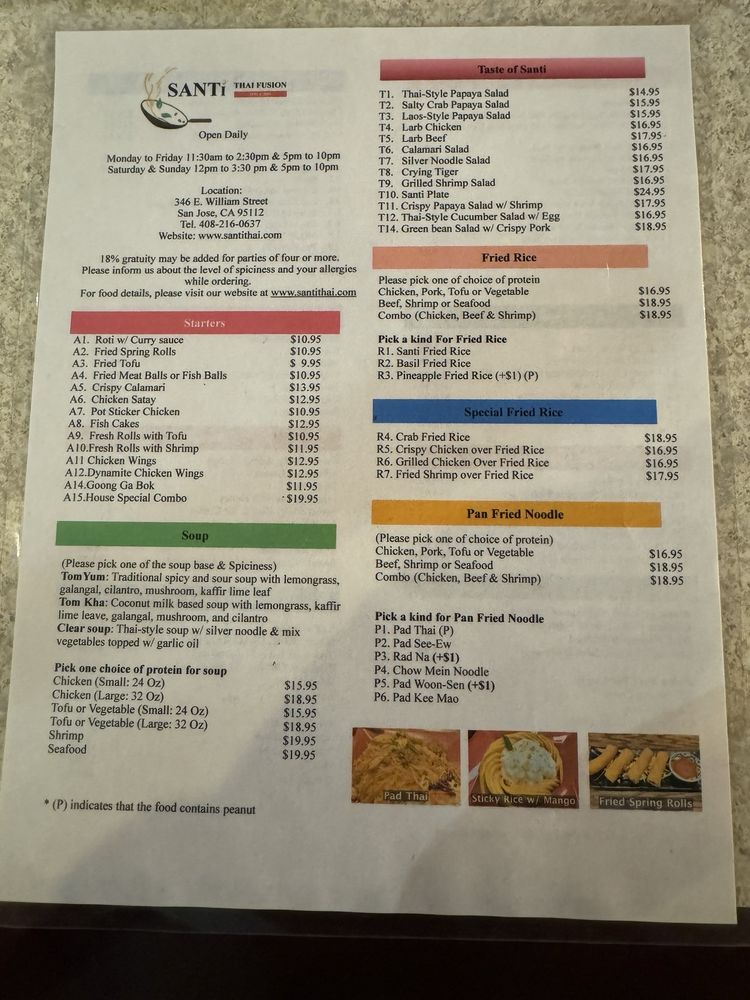 Welcome to Santi Thai Fusion, a delightful culinary haven nestled in San Jose, CA. The menu here is a vibrant tapestry of authentic Thai flavors, featuring heavenly soups and aromatic curries that are sure to tantalize your taste buds. From the fragrant Green Curry to the comforting Basil Sauteed, each dish showcases fresh ingredients and skillful preparation.
